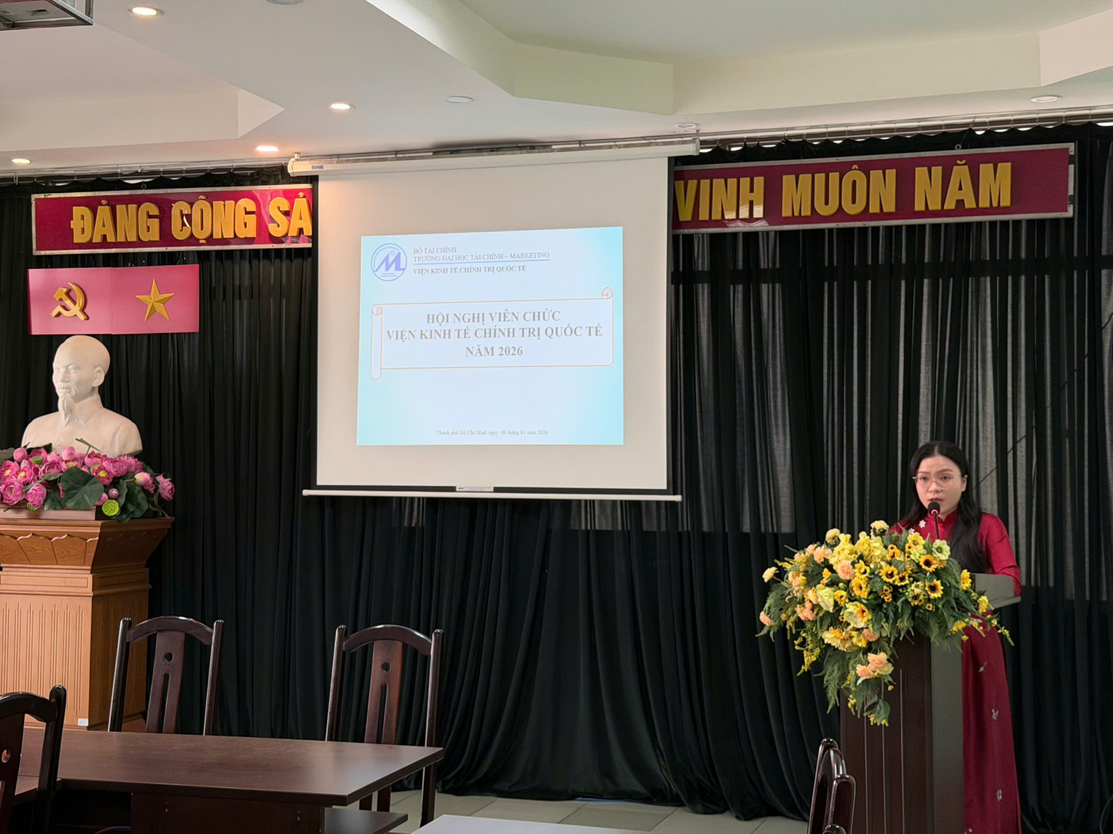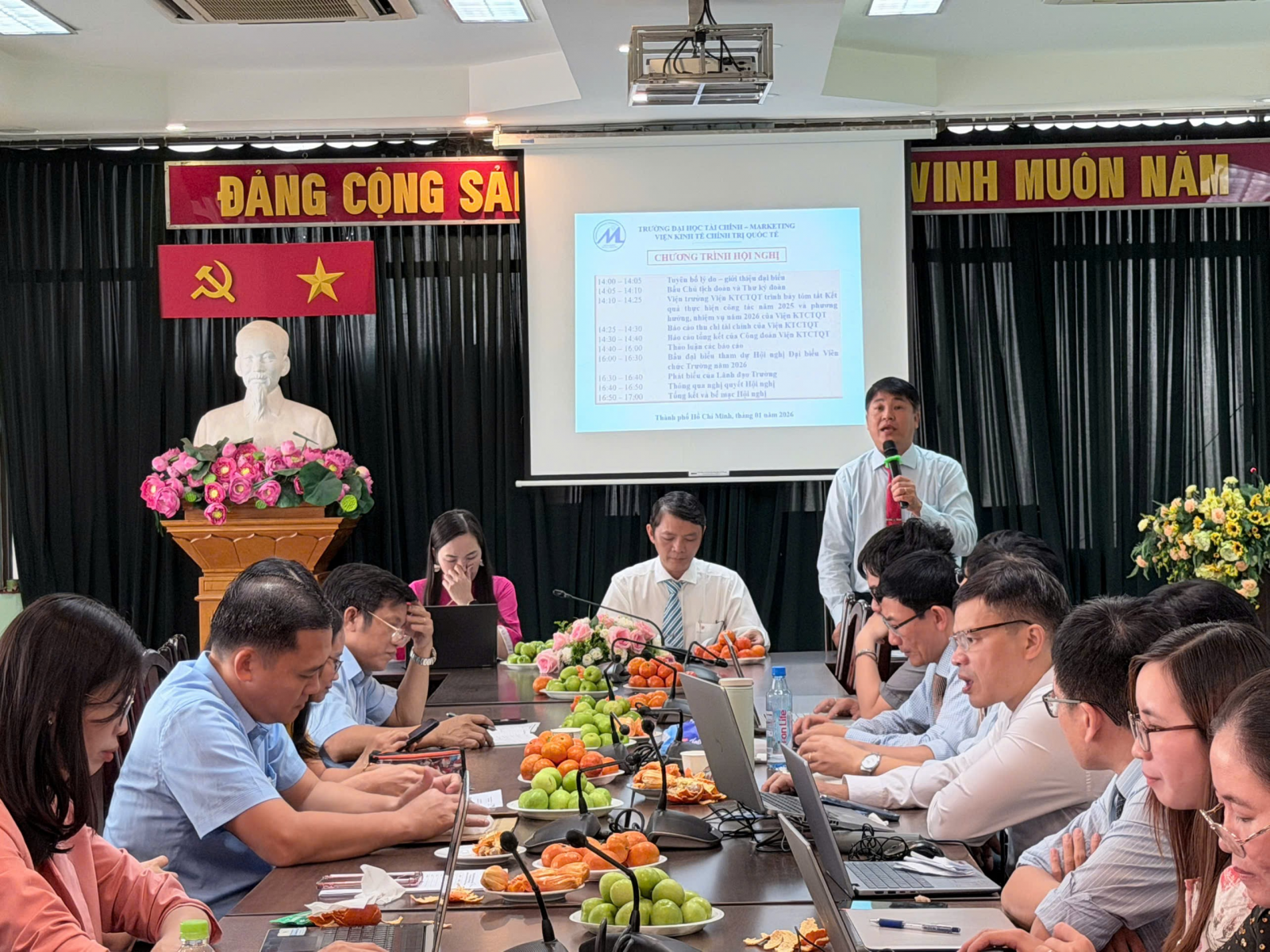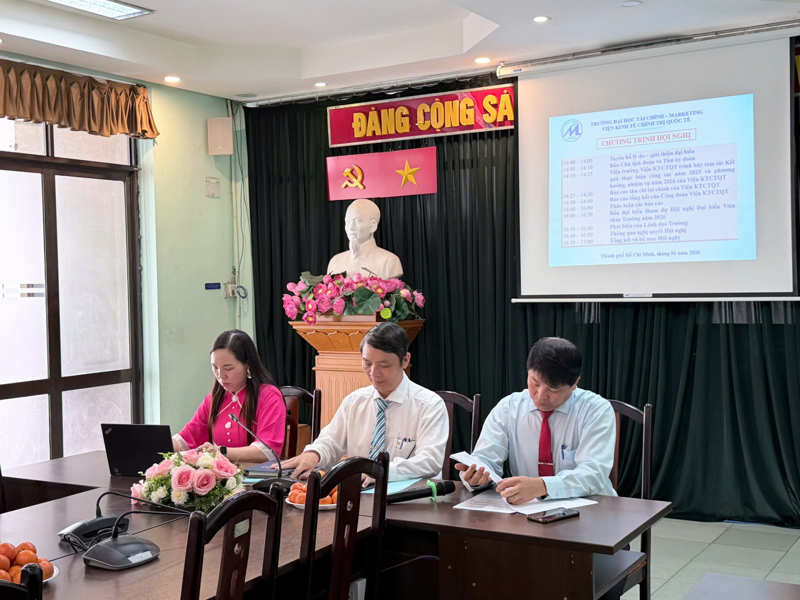 Thực hiện kế hoạch số 4352/KH-ĐHTCM ngày 04 tháng 12 năm 2025 của Trường Đại học Tài chính - Marketing V/v Tổ chức Hội nghị đại biểu viên chức và người lao động (VCNLĐ) năm 2026, Viện Kinh tế chính trị quốc tế (KTCTQT) tổ chức Hội nghị Viên chức vào lúc 14h00, thứ 5, ngày 8 tháng 1 năm 2026 tại Phòng B.001, Trụ sở 778 Nguyễn Kiệm.