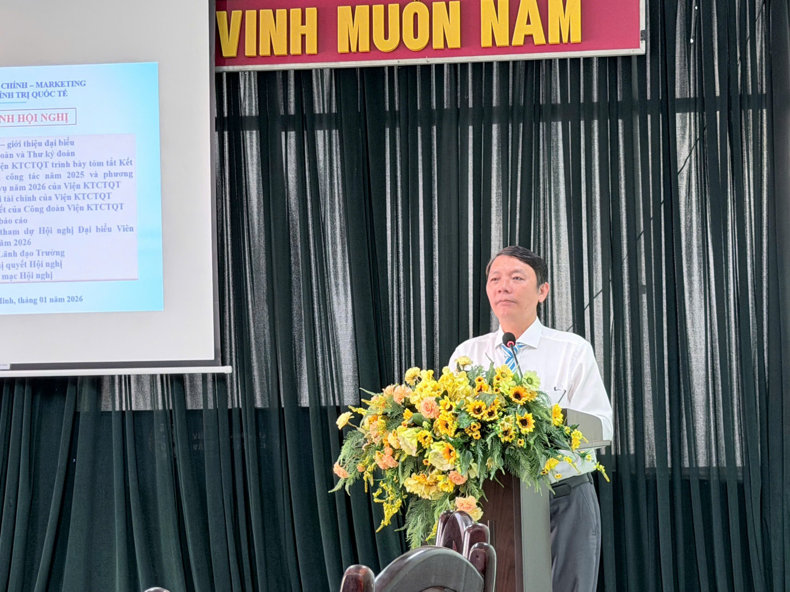 Cuối cùng, Đoàn Chủ tịch điều hành Bầu Đại biểu dự Hội nghị Đại biểu VCNLĐ cấp trường (20 đại biểu chính thức và 2 đại biểu dự khuyết) và Thông qua Nghị quyết Hội nghị VC Viện KTCTQT, Kêu gọi toàn thể VC Viện nỗ lực không ngừng, đoàn kết, thống nhất để Hoàn thành tốt nhiệm vụ giảng dạy, nghiên cứu khoa học, tuyển sinh 03 ngành mới trình độ đại học, thạc sĩ và tiến sĩ, thực hiện tốt các nhiệm vụ, công tác theo sự phân công, chỉ đạo của Nhà trường, tiếp tục là đơn vị Hoàn thành xuất sắc nhiệm vụ năm 2026.